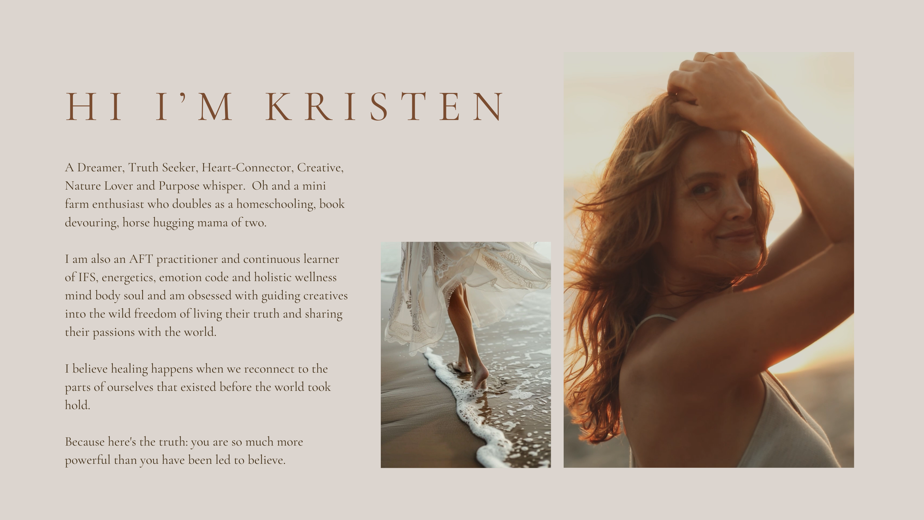 Kristen's unique blend of modalities deepens the emotional healing process, creating a personalized, holistic experience that empowers creative individuals to heal deeply, reconnect with their authentic selves, and embrace all the messy and beautiful parts of themselves, ultimately freeing them up to be the highest and most authentic version of themselves and share there gifts with the world without hesitation.