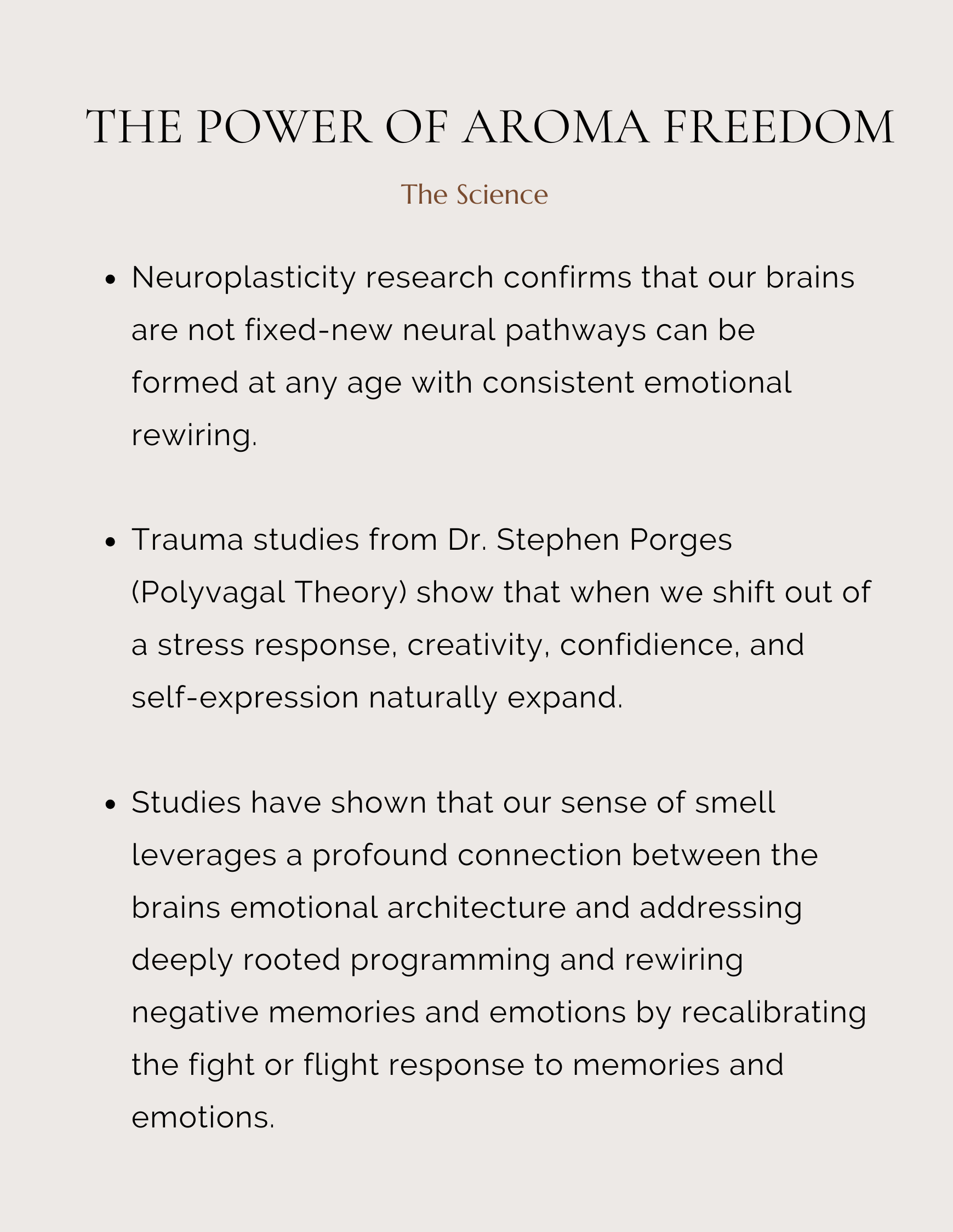 Aroma Freedom is a transformative technique developed by Dr. Benjamin Perkus, a Psychologist and EMDR specialist, who discovered that the sense of smell is a more powerful catalyst for emotional and behavioral change than the rapid eye movement traditionally used in EMDR. By combining the science of essential oils with a step-by-step process, Aroma Freedom helps release negative thought patterns, overcome emotional blocks, and reprogram the subconscious mind in align with one's highest potential.